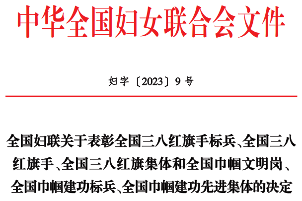 近日,中华全国妇女联合会印发《全国妇联关于表彰全国三八红旗手标兵、全国三八红旗手、全国三八红旗集体和全国巾帼文明岗、全国巾帼建功标兵、全国巾帼建功先进集体的决定》(妇字〔2023〕9号),BB贝博艾弗森控股集团办公室行政部上榜,获评“全国巾帼文明岗”。